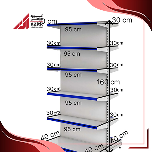 قفسه هایپری دو طرفه ۶ طبقه با طراحی مدرن و ساختار فلزی مستحکم، انتخابی هوشمندانه برای چیدمان منظم و نمایش مؤثر کالاها در فضای فروشگاهی است. عرض ۹۵ سانتی‌متر و ارتفاع ۱۶۰ سانتی‌متر، فضای کافی برای قرارگیری انواع محصولات را فراهم می‌کند. طبقه پایین با عمق ۴۰ سانتی‌متر برای اقلام حجیم‌تر و طبقات بالایی با عمق ۳۰ سانتی‌متر برای کالاهای سبک‌تر طراحی شده‌اند. طراحی دو طرفه این قفسه، امکان دسترسی از هر دو سمت را فراهم کرده و باعث افزایش بهره‌وری در مسیرهای عبوری فروشگاه‌ها می‌شود.